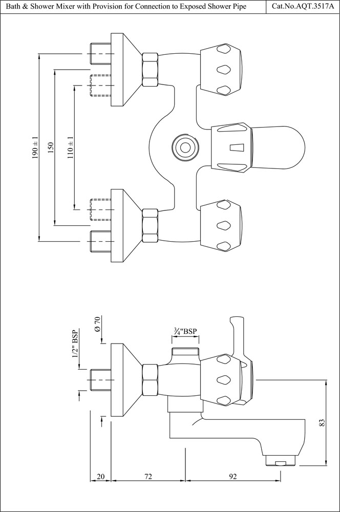 Bath & Shower Mixer with Provision for Connection to Exposed Shower Pipe (SHA-1211N), Wall Mounted