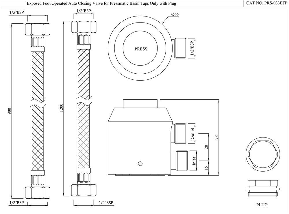 Exposed Foot Operated Non-concussive Valve for Pressmatic Basin Taps Only with Plug (Table Mounted Model) with Two 900 & 1200mm Long Braided Hoses with 15mm Nuts